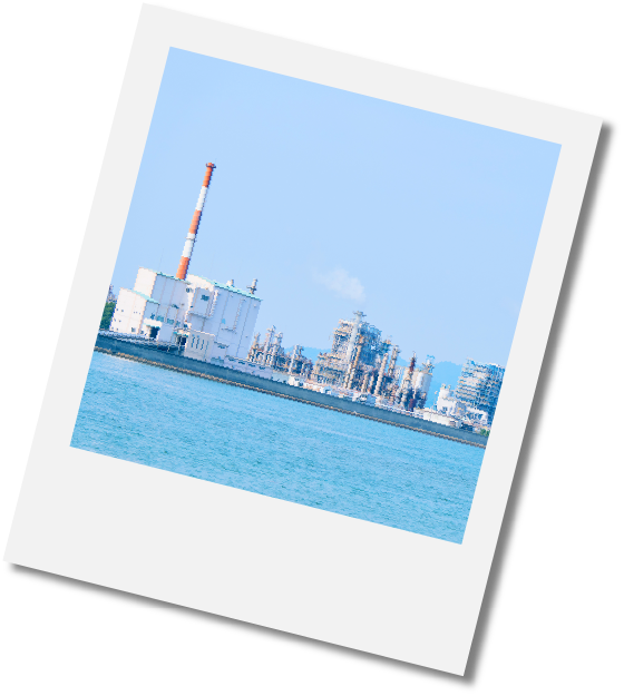 探究心と希望に満ちた二人を見守るように輝くダイセルの工場。