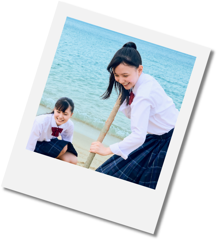 砂浜を走る女子高生。流木を手に、