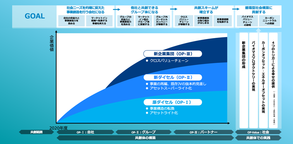 新ダイセル(OP-Ⅱ)では、既存事業の周辺領域でのM&Aや提携による領域拡大、既存事業の再編や合弁会社の抜本的見直しに取り組むとともに、グループ全体でのアセット・スーパーライト化を目指します。