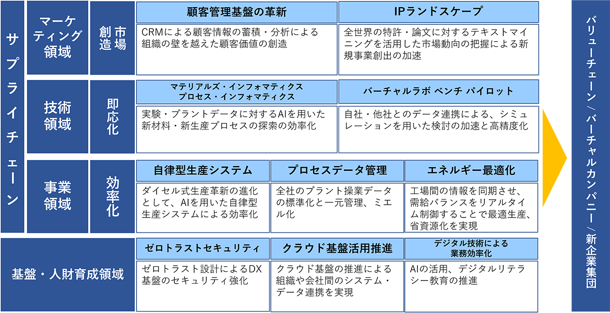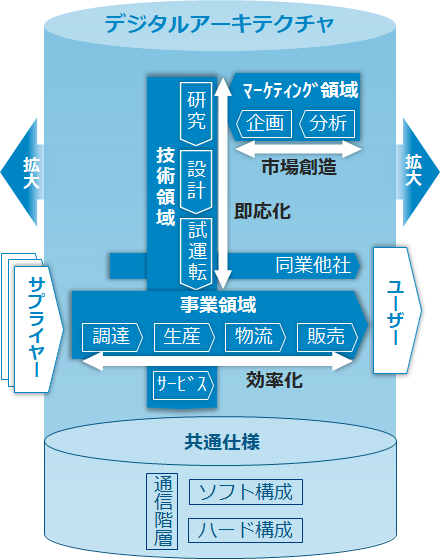 当社の事業全体を「マーケティング領域」「技術領域」「事業領域」といった領域に区分し、マーケットへの「市場創造」や「即応化」、組織の壁を越えたシステム設計による「効率化」を促進する施策に取り組みます。また、すべての事業領域の土台となる「基盤・人財育成領域」では、「全従業員が信頼性のあるデータ(事実と予測)に基づく意思決定ができるような基盤整備と人財育成」に取り組みます。それらの施策を通じて「デジタルアーキテクチャ」を構築し、当グループ、他社・パートナー企業へと拡大させ、共創スキーム(バリューチェーン)を確立します。