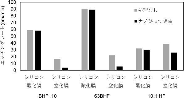 シリコン窒化膜上に選択的にセルロース薄膜が形成される特徴を活用すると、バッファードフッ酸(BHF)やフッ酸(HF)などのエッチング液からシリコン窒化膜を保護する、保護膜として機能することが分かりました(下図)。目的とするシリコン酸化膜のエッチングには悪影響を与えない為、半導体製造プロセスの生産性はそのままに、副反応であるシリコン窒化膜のエッチングを抑制します[1,2]。つまりナノひっつき虫™を活用することで、①既存のエッチング液が使え、②生産性も維持しつつ、③シリコン酸化膜とシリコン窒化膜のエッチング選択性を向上することが可能です。また、ナノひっつき虫は水系材料ですので、ウェットプロセスの既存設備をお使いいただけます。