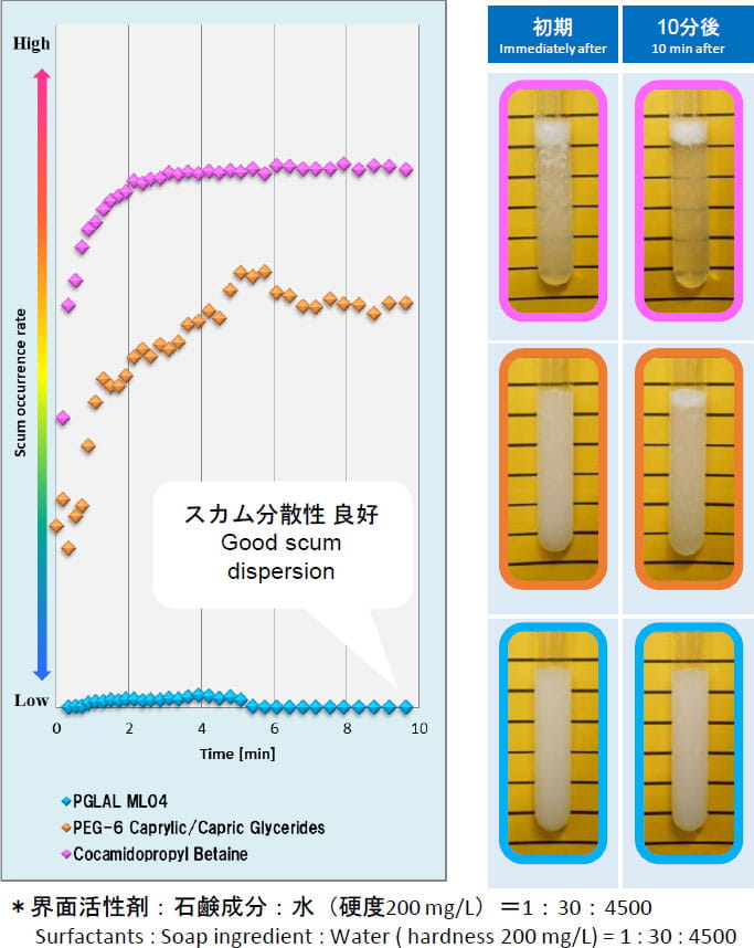 界面活性剤、石鹸成分、水(硬度200 mg/L)を混合し、液面に浮上してくる石鹸カスの発生度合いを溶液安定性評価装置を用いて評価した。