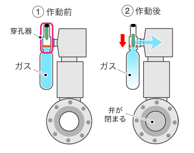計装エアで作動するアクチュエータ付き緊急遮断弁等において、駆動源をガスカートリッジ用穿孔器に置き換えることで、配管等の付帯設備やメンテナンス費用の削減が可能です。また、大規模災害により計装エアの供給が停止した時でも、起動させることが可能です。