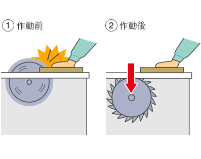 テーブルソーを緊急停止する際に、ストロークの長いピンプッシャーを作動させることにより、ノコギリの刃の回転軸を押し下げて、刃がテーブル面の下に隠れます。これにより、作業者の安全を守ります。
