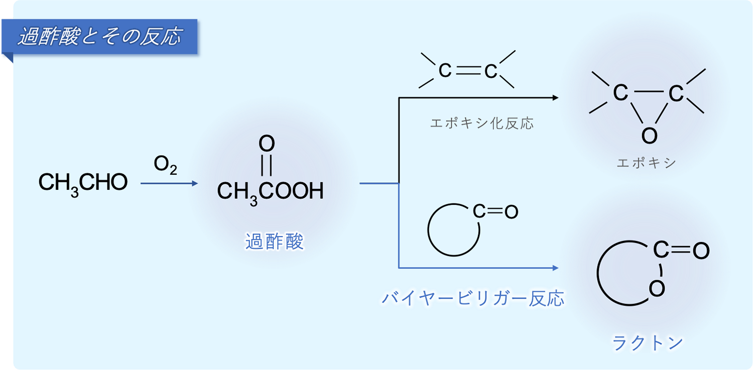 当社では、過酢酸を用いた酸化反応によりε-カプロラクトンおよびその誘導体(プラクセル®)を製造しています