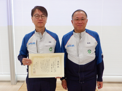 RC委員会では毎年度、RC活動における善行や貢献に対して表彰を行っています。2024年度は、以下2件の取り組みについて、当社新井工場ならびにダイセル新井ケミカル株式会社の12名が表彰されました。