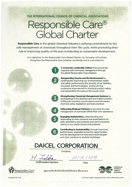 同憲章は、化学製品の安全な管理、化学製品による生活の質の改善、持続的発展への貢献に向けて取り組むべき課題をより明確にすべく2014年に改訂され、同年、当社も「レスポンシブル・ケア世界憲章」(2014年改訂版)支持宣言書に、あらためて署名しています。